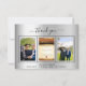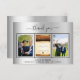 Lägg till 3 av dina foton, lodrät storlekt, ett datum, namn och tackkortet. Ett faux silver tittar bakgrund med svart text och ram. Texten: Tack på framsidan och ditt namn på baksidan skrivs med ett handskript med snyggt med dekortecken.