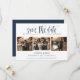 Fotot med elegant marin blå bröllop 3 sparar datumkorten med modern kalligrafi. Anpassa det här kortet enkelt med information om bilder och bröllop, inklusive en webbplats för bröllop.
