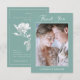 Denna eleganta redigerbara bröllopskort är utformad som en anpassningsbar mall för uppladdning av foto, så att du kan visa ditt eget bröllopsfoto på framsidan. Ett förfinat tackmeddelande i flytande kalligrafiskrift visas i en mjuk, salvia grön palett, kompletterad med subtil ramning och en elegant blomsterdesign för en modern, tidlös look.