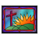 En nedfläckad-glasdesign som illustrerar Påsk morgon, där en röd kor står på grönt backe bredvid ett eländigt solupplopp.