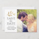 Bröllop spara datum-kortet har en gren i guld färgad som accentuerar denna enkla naturinspirerade utformning. Innehåller ett foto från porträtt på framsidan och ett liggande foto på baksidan med mörk grått/mjuk svart elegant som kan vara personlig.
