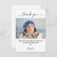 Vit bakgrund. Stora bokstäver med dekortecken och text: Tack. Anpassa och lägg till foto, tackkort och namn.