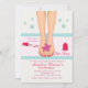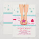 En vacker inbjudan till en spadag för att fira en speciell födelsedag eller som tjejaktivitet inför bröllopet. Kortet har en bild på fötter med röd nagellack med vågig kant och blommig bakgrund. (FP)