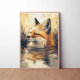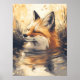 Bilden visar en närbild av en röd räv med ögon stängt, nedsänkt i en kropp av vatten. Frävens päls är en pulserande orange med vita accenter, och öron är redo. Vatten är en muterad brun och grått som avspeglar ljuset från den omgivande bladytan. Bakgrunden är en mjuk oskärpa av guldfärgade och bruna nyanser, vilket antyder en skogsmiljö.