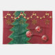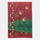 Lagrar av dödligor utgör denna stiliserade julutformning. En röd bakdel med mutage, en spikaktig grönt träd, guld-stjärnor och snöflingor hängande från ett stativ av rött och guld pärlor och tre röda bollar med en virvelformad guld hängande framför sig.