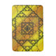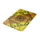 Tre stilar av handdragna fraktioner, inklusive Sierpinski-trianglar, Apolloniska packningar och en liknande tematisk fyrkantig design, utgör lagrar i denna geometriska mandala, överlagrad på en ljus gult- och orange-gradient.