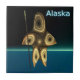 En brunt tonad fractal-bild som antyder en högstiliserad inuitjägare med traditionella päls-kläder, som håller i en harpun med ett elfenbenshuvud. Bilden läggs ovanpå en bakgrund som skildrar polarna mörk vinter. Texten "Alaska" visas i blått och vitt.