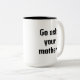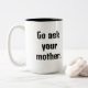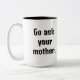 Kaffet mugg som lyder: "Gå och fråga mor." Stor svart text och roligt. En gammal fras som har använts för generation. Föräldrar behållor mellan dem.