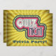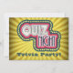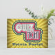 Tyst trivia-festinbjudan. Med stor fet typografi omgiven av klädrum ljus. Bakgrunden är en gult sunburst mönster.