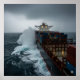 En högkvalitativ bild av en stor frakt av last i en storm, där mäktigt vågar kraschar mot skrovet och ett tungt, övervältat himmel.