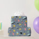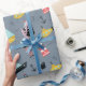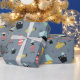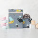 Omslagning papper med ett vackert mönster med segelbåtar och fraktaser av gult och svart tecknad, söta ubåtar, en segelman med svart skägg, röda byxor och ett rör, ett rött och vitt fyr och ett svart ankare på en ljusblå bakgrund som dekorerats med små bubblor och vågar.