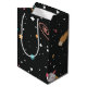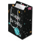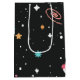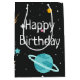 Astronomiplaneter, kometer och stjärnor i svart med raketfraktaser för födelsedag. Text kan redigeras eller tas bort.