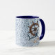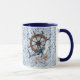 En frakts ratt med en haj. En musselfisk och en har av stjärnfisk som fångats i fiskenätet. I bakgrunden finns det en linje mönster och en våg mönster i olika blå nyanser, med lugn och sjöfartsklimat. Kombinationen av dessa inslag skapar en harmonisk och lugnande utformning som stimulerar fantasin och kanske till och med gör att man längtar efter havet.