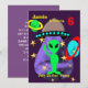 En gullig grattis på födelsedagenmeddelandeinbjudan för alla de ungar som har en themed födelsedagsfest för rymden. En rolig bild av planet, stjärnor, utrymmefrakter och ett gulligt lite grönt främmande yttre. Glöm inte att ändra namn, ålder, och meddelandet här är ingen extra kostar.