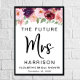 Modern personlig välkomstskylt "Den framtida Fru" för din bröllopsfest. Övre kanten pryds av burgunderfärgade, röda och rosafärgade akvarellblommor och grönt. "Fru" är skrivet med en stor elegant typsnitt, och du kan anpassa med din framtida efternamn, förnamn och bröllopsfestens datum.