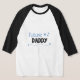 Framtida pappas skjortor, mugg, kort, knappar, magneter och andra framtida pappa-kläder och presenter med blå och svart text och stjärnor.