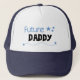 Framtida pappas skjortor, mugg, kort, knappar, magneter och andra framtida pappa-kläder och presenter med blå och svart text och stjärnor.