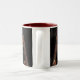 Fyll, dricka, och repetition för mest fridfull dricka erfar. Två-tona muggar som är tillgänglig i svart/vit och rött/vit. 11 uns eller 15 uns format.