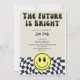 Tema för barn av coola och roligt Retro 3:e födelsedagsinbjudan med Coola retro stilar med kontrollerad mönster och lycklig ansikteTexten säger "unge, vild och tre". Perfekt för en pojkes födelsedagsfest. Modern roligt-inbjudan till vintage-studentfest med handskript med texten "Framtiden är ljus". Det finns en vit och bakåtriktad mönster vid grund tillsammans med lycklig ansikte. Du kan lägga till student-fotot på baksidan av kortet.