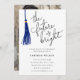 Modern studentfest-inbjudan-mallkort med handskrivet typografiskt skript som säger "framtiden är ljus". Det finns en illustration av en blå tassel bredvid den. Du kan lägga till student-fotot på baksidan av kortet. Underbar för både high school och College student.