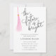 Modern inbjudan till examensfest mallkort med handskriven typsnittsmanus som säger "framtiden är ljus". Det finns en illustration av en ljusrosa tofs bredvid den. Du kan lägga till examenfotot på baksidan av kortet. Perfekt för både gymnasie- och högskoleexaminerade.