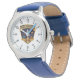 Denna personliga barnklocka har ett djärvt och livfullt märke för rymdutforskare. I mitten av märket finns en lekfull tecknad raket som flyger genom rymden med planeter som kretsar runt den.