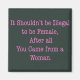 I rosa står det: "Det borde inte vara olagligt att vara kvinna, när allt kommer omkring kom du från en kvinna."