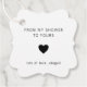 Minimalistiska etiketter för bröllopsdusch med budskapet "Från Min Dusch Till Din" och ett hjärta samt ditt namn i svart på vit bakgrund. Utformningen kan anpassas efter dina önskemål. Perfekt för den minimalistiska bruden som vill ge sina presenter en personlig touch.
