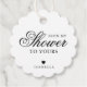 Eleganta typografi bröllopsdusch favorit taggar med en enkel design med budskapet, "Från mitt bröllopsdusch till ditt" i svart kalligrafi och seriffer teckensnitt, på en vit bakgrund. Nedanför finns ett hjärta och ditt namn. Teckensnitt och bakgrundsfärger kan ändras till valfri färg du önskar. Dessa snygga och exklusiva taggar är ett bra sätt att lägga till en personlig touch till dina presenter.