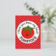 Söt rund ljusröd tomat med fem gröna blad som hår och ett lyckligt leende ansikte. Ovanför och under tomaten finns en rolig ordlek i svart text som lyder "Jag älskar dig från mitt huvud tomater". Bakgrunden är röd med ett retro-mönster av gula prickar.