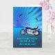 Grattis på födelsedagen kort med motorcykel. Skicka ett kort från en grupp vänner eller kolleger. Ett perfekt-kort för en biker. En blå motorcykel med stiliserad solnedgång och flygande fåglar. Vilken cykelentusiast som helst kommer kärlek att få ett sådant kort.