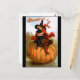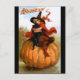 En charmerande vintage Halloween-kort med en ung häxa sitta med sin svarta katt på en stor pumpa, målad av den amerikanske bildaren Frances Brundage.