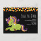 Spara datumet Halloween-födelsedagsinbjudan med en bild av en Frankenstein-encorn. Lila och grönt färg. Spooky söt.