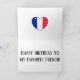 Fin design omfattar lycklig-ballonger och däcksband med ord "Grattis på födelsedagen", allt i färg i Frankrike flagga. Design avslutas med hjärtat i Frankrike flagga färg och med födelsedagsmeddelandet som är helt anpassade. Det här färgfulla födelsedagskortet är den perfekt som finns för din vän från Frankrike.