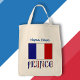 Tote-väskan som är konstruerad på framsidan har bara Franskens Flagga med ord FRANKRIKE nedanför i brev färgad med Franskens tricolor. Ovanför är ett ställe för ditt namn i blå brev eller någon annans, så du kan skapa en gåva eller ett personlig utseende. Underbar för Bastiljens dag. Roligt för vänner eller familjeåterföreningar och klubb- eller resegrupparrangemang.