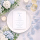 Franskblå menykort för bröllop 13x18 cm med delikat hydrangea-konst och tidlös serif-typografi — ett förfinat borddetalj som omedelbart förhöjer din mottagning.