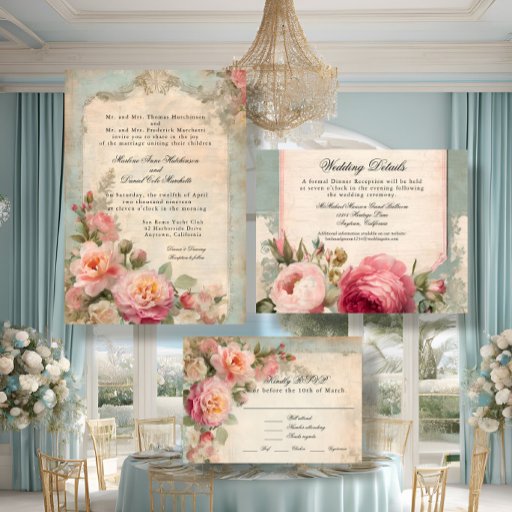 Fransk Blue Rosa ros Blommigt Elegant bröllop Inbjudningar