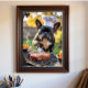 Den här charmerande bilden har en Fransk Bulldog som är skickligt förankrad i en vit kock och en hätta, som på ett iögonfallande sätt griper över en öppen låga på ett utomhusgrepp. Med hjälp av grillredskap i tass förbereds måltiden mitt i hund stigning rök, vilket förkroppsligar en humoristisk och närliggande kulinarisk scen. Bakgrunden antyder en varm, solig utomhusmatning