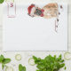 Ett dekorerat Julgran omges av presenter och ett rött lager. En söt Fransk Bulldog bär en tomathatt och en buggslips. Hund lämnade grumligt tass avtryck. Skicka den här presenten till helgdagarna!