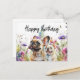 Denna födelsedagskort har en fransk bulldog i ett blomsterfält. Hunden är omgiven av färgglada blommor, med ett födelsedagsmeddelande skrivet i kursiv stil