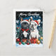 Skicka glatta helgdag önskemål med det här julvykortet för den festive Fench Bulldog med två vackra Fransk Bulldog. Under jultomten och omgivna av helgdag, inklusive färgstarka prydnadsföremål och inslaget presenter, skapar dessa Fransk Bulldog en härlig vinterscen. Snöflingor faller försiktigt mot en stjärnnatt himmel, vilket tillför den mysiga inställningen en gnutta magi. Med God jul i ord, som visas, är det här för julkort från Fench Bulldog perfekten till värme och glädje med kära och Fransk Bulldog älskare under julhelgen. generöst innehåll