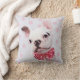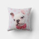 Fransk Bulldog-valp, 7 månader gammal, med rosa armbåge och som tapet i bakgrunden, med rosa polka dots.