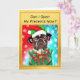 Önska God Jul med denna vintage hund juldesign från Loud and Sassy-butiken. Designen visar en söt fransk bulldog som bär en ful jultröja, en tomtehatt och en julkranshalsband med röd rosett och gyllene bjällror. Med en rolig hundpun, "Kan jag öppna mina presenter nu?", som är allt denna söta lilla rashund vill veta. Inkluderar även traditionella Julhälsningar. Texten är helt anpassningsbar och kan enkelt ändras till vad du önskar för en verkligt personlig touch! Perfekt för hundälskare, de som gillar roliga ordlekar och perfekt för djurälskare som älskar att fira den festliga säsongen med sina pälsiga barn!