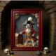 Den här fängslande bilden har en charmerande Fransk Bulldog, klädd som en stor pirat-kapten, komplett med en luddig tricorn-hatt och en utsmyckad röd och svart jacka med guld-trim. Hund är stolt över att ett tass vilar på en gammal, metallbunden skattkista, omgiven av utspridd guld mynt. Dess tunga gör en uppspelning och tillför humor en liten bit till detta äventyrliga porträtt.