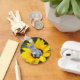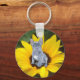 Den här färgstarka nyckelkedjan har ett sött grått, blått, Fransk Bulldog-valp, sitta i en jättelik gult solros.