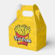 Tecknad illustration av liten förpackning med fransk fries. Skräckmatets dispositionsikoner i gultens mönster-bakgrund. Anpassningsbar på båda sidor.