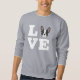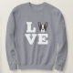 Älskar du franskie eller känner någon som gör det? Den här sweatshirten med fransk kärlek är det perfekta tillskottet till alla franska bulldogälskares garderob. Designen har en söt svart-vit fransk bulldog-ansikte och ett fetstilad vitt typsnitt som tillsammans stavas ut som KÄRLEK.