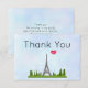 Ett tackkort från party med ett viskigt teckning i Eiffel Torn omgivet av grönt träd och rosa vattenfärgshjärta flytande i luft.