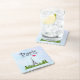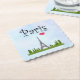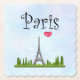 Pappert underlägg med ett viskigt teckning i Eiffel Torn omgivet av grönt träd och rosa vattenfärgshjärta flytande i luft. Ljusblå bakgrund.