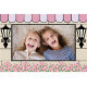 Parisian flickig födelsedagsram att använda som fotobås. Ett bra rekvisita för att komplettera en "Emily in Paris" temafest. Ramverket visar ett parisfönster med utomhus rosa blommor dekoration.